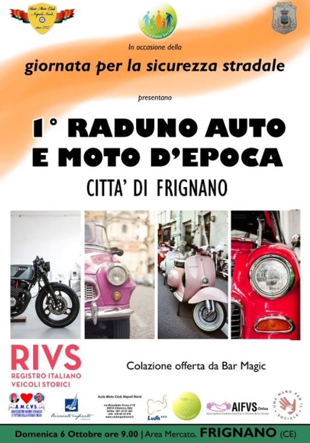 FRIGNANO (Carla Caputo) – Una mattina all’insegna dei motori e della sicurezza stradale. Domenica 6 ottobre, presso l’area mercato, si terrà il 1° raduno auto e moto d’epoca (figuranti nel Registro Italiano Veicoli Storico). La manifestazione, patrocinata dal Comune di Frignano capitanato dal sindaco Gabriele Piatto, è stata organizzata dall’Auto Moto Club Napoli Nord di Matteo Ciccarelli e dall’associazione “Generazione Sociale” presieduta da Nicola Pagano. Ad appoggiare l’evento anche l’associazione “Mamme Coraggio e Vittime della Strada” Onlus (A.M.C.V.S.), presieduta da Elena Ronzullo, l’associazione “Orizzonte Infinito Onlus”, l’associazione “Ludis”, l’associazione di volontariato “Il volto sociale”, l’associazione Italiana Familiari e Vittime della Strada Onlus (A.I.F.V.S. Onlus), nella persona del referente Aversa e agro aversano Biagio Ciaramella, e l’associazione “Una mano per il sociale”.