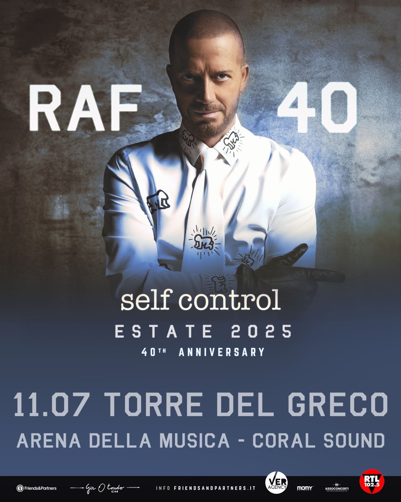 Raf torna ad infiammare le arene estive con SELF CONTROL 40TH ANNIVERSARY SUMMER TOUR, per celebrare il 40° anniversario non solo di una delle hit più famose di sempre, ma anche della carriera straordinaria del padre del pop in Italia. Venerdì 11 luglio 2025 porterà il suo show a Torre del Greco (Napoli), al Coral Sound – Arena della Musica.
