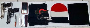 Bloccati e fermati 2 dei 5 rapinatori, i militari hanno scoperto che l’auto che guidavano fosse il bottino di una rapina perpetrata la notte prima a Casoria ai danni di un padre e della propria figlia. Nel veicolo i carabinieri hanno rinvenuto due pistole scacciacani prive di tappo rosso, due coltelli e vari accessori verosimilmente utilizzati per compiere le rapine: una sciarpa, uno scaldacollo e un cappello di lana.