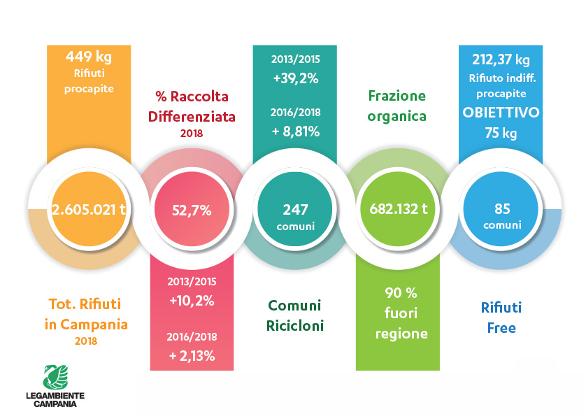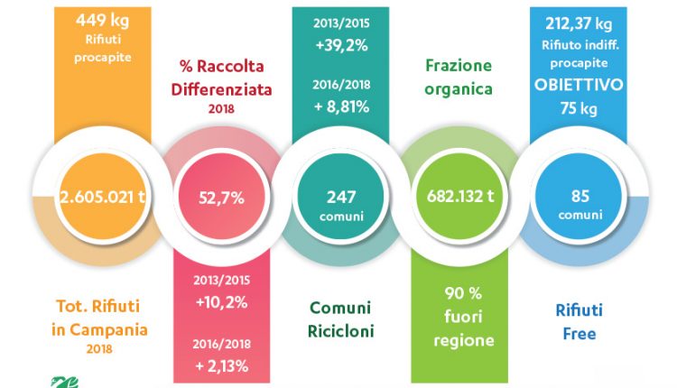 Nel dettaglio della Campania che differenzia sono 1.440.118 i cittadini campani che conferiscono in maniera corretta i rifiuti nei 247 comuni ricicloni che, nel 2018, hanno superato il limite di legge del 65% di raccolta differenziata. Tortorella (Sa), Montesano sulla Marcellana (Sa), Vico Equense (Na), Pozzuoli (Na) sono i comuni ricicloni vincitori nelle quattro categorie per numero di abitanti.
