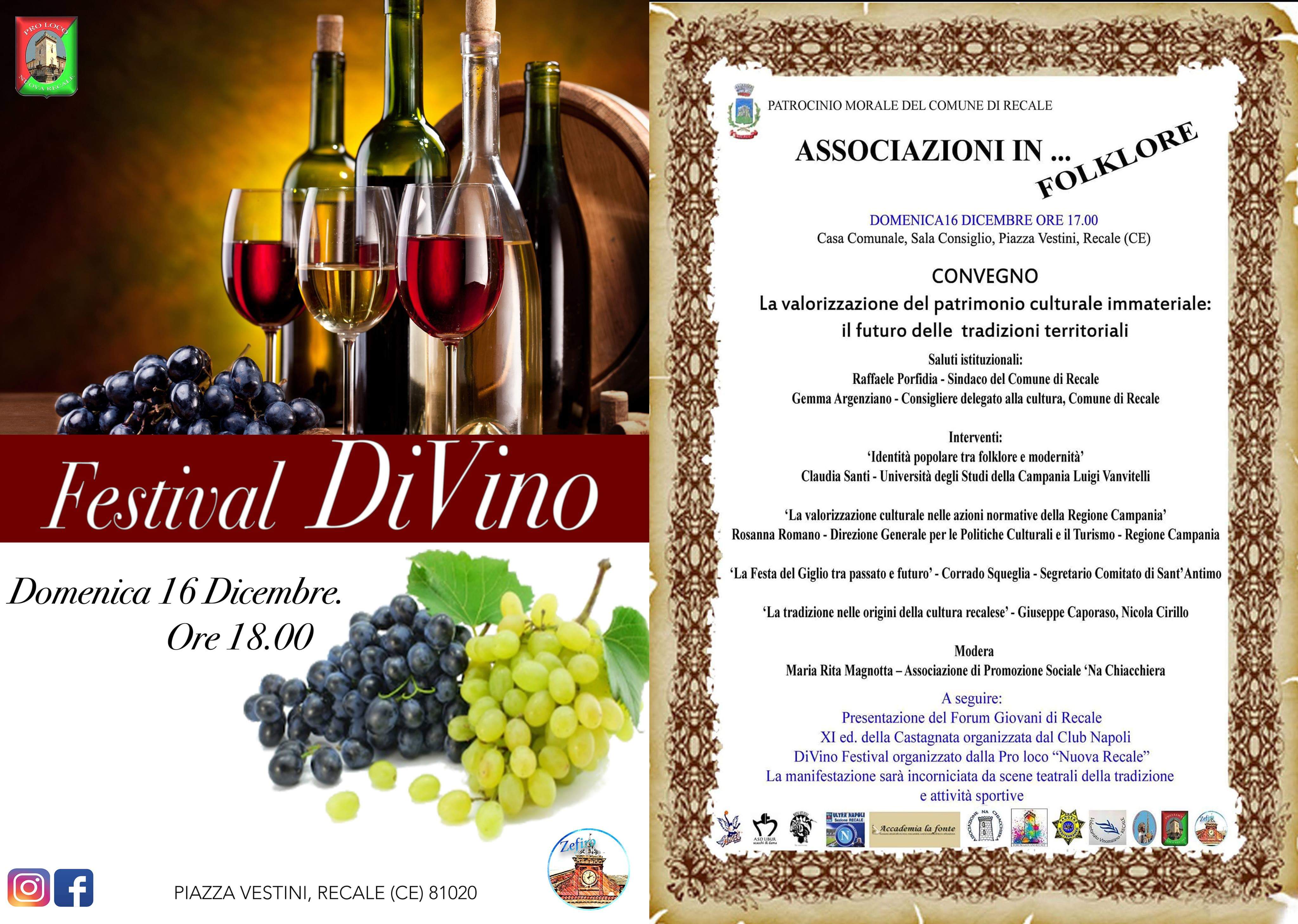 RECALE – Domenica 16 dicembre dalle ore 17.00 l’associazione giovanile “Zefiro” e la “Pro loco Nuova Recale” presenteranno l’edizione 2018 del Festival DiVino, che si svolgerà nella cornice della prima edizione dell’iniziativa “ Associazioni in Folklore”; un evento all’interno della manifestazione natalizia “Natale a Recale”, organizzata dall’Amministrazione Comunale, che vedrà le associazioni del territorio recalese impegnate in diverse attività per la valorizzazione delle tradizioni locali, attraverso un convegno sulla valorizzazione del patrimonio culturale immateriale a cura dell’associazione “Na Chiacchiera”, la presentazione alla cittadinanza del Forum dei Giovani di Recale e la XI edizione della “Castagnata” organizzata dal Club Napoli di Recale.
