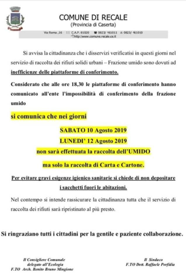 RECALE – Per problemi comuni anche ad altri enti locali limitrofi con le piattaforme dello smaltimento della frazione organica, mercoledì, la raccolta dell’umido a Recale avviene più a rilento rispetto agli altri giorni. L’Amministrazione Comunale di Recale, guidata dal Sindaco Raffaele Porfidia ed il Consigliere comunale delegato all’Ecologia, Benito Bruno Mingione, hanno comunicato alla cittadinanza tutta che: “SABATO 10 AGOSTO 2019 e LUNEDI’ 12 AGOSTO 2019 NON SARA’ EFFETTUATA LA RACCOLTA DELL’UMIDO, MA SLO LA RACCOLTA DI CARTA E CARTONE. Per evitare gravi esigenza igienico sanitarie si chiede di non depositare i sacchetti fuori le abitazioni. Nel contempo, si intende rassicurare la cittadinanza tutta che il servizio di raccolta dei rifiuti sarà ripristinato al più presto”.