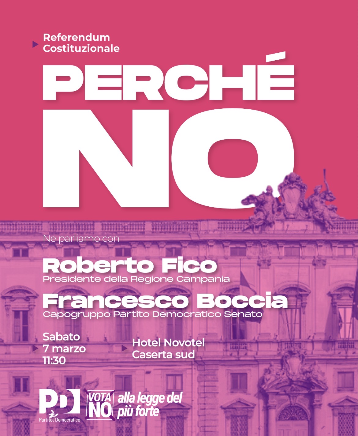 CASERTA – Sabato 7 marzo, alle ore 11.30, presso l’Hotel Novotel di Caserta Sud, si terrà l’incontro “Perché No”, promosso dal coordinamento provinciale del Partito Democratico di Caserta. L’iniziativa è aperta a iscritti, amministratori locali e cittadini, nell’ambito della campagna referendaria in vista del voto del 22 e 23 marzo. Interverranno il presidente della Regione Campania, Roberto Fico, e il capogruppo del Partito Democratico al Senato, Francesco Boccia. Prosegue intanto la mobilitazione dei democratici in Terra di Lavoro, con iniziative già avviate nei circoli del territorio. Al centro del confronto i temi della riforma della giustizia e la tutela dell’autonomia e dell’indipendenza della magistratura, indicata dal Pd come architrave dell’assetto costituzionale. Un appuntamento che si inserisce in una fase politicamente sensibile del dibattito nazionale, alla vigilia di un passaggio referendario destinato a misurare gli equilibri tra politica e giustizia.