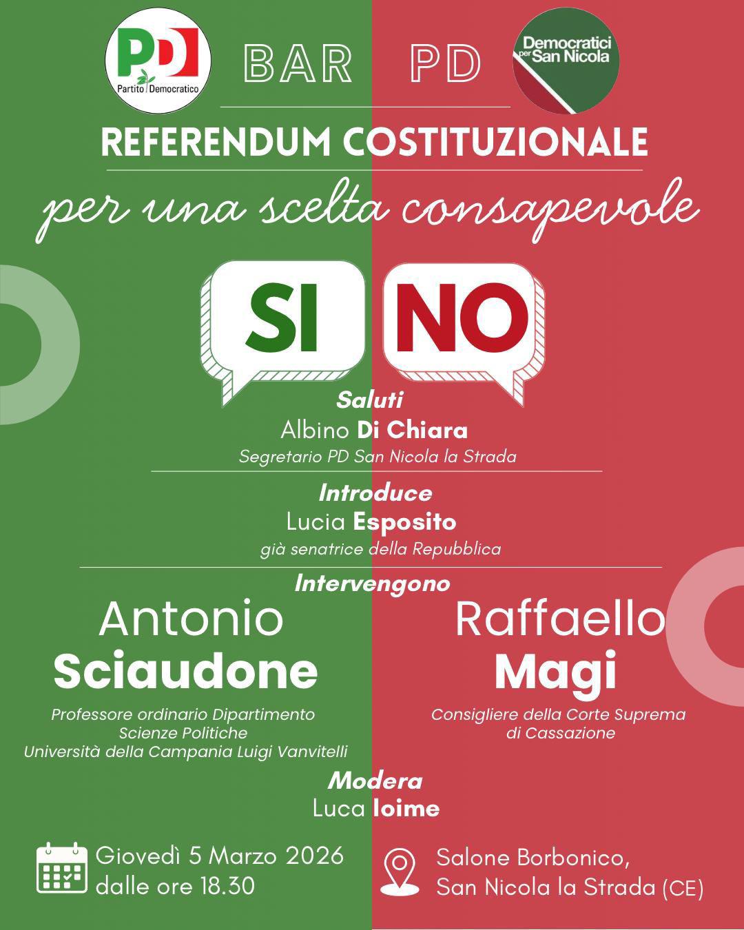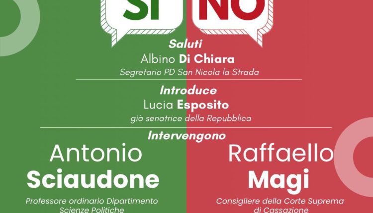 L’iniziativa è promossa dal Circolo cittadino del Partito Democratico e dai Giovani Democratici di San Nicola la Strada, con l’obiettivo di offrire ai cittadini un momento di confronto e approfondimento tecnico sulla riforma della giustizia oggetto del referendum confermativo.