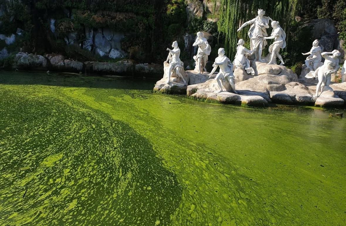 Lo stato di degrado della via d’acqua è sotto gli occhi di tutti: cascate senza acqua, vasche con poca acqua senza il necessario ricambio, proliferazione di alghe autotrofe e sofferenza della fauna ittica, fossati e canali asciutti o con poca acqua stagnante, proliferazione di zanzare che, come è noto svolgono il ciclo biologico deponendo uova in acqua stagnante che in pochi giorni passando per le fasi di larva e pupa diventano adulte. Il gruppo ha segnalato la pericolosità in questo periodo anche per l’emergenza del virus West Nile che ha colpito sembrerebbe almeno 10000 persone in Italia con il decesso di 3 soggetti fragili solo in Campania. Il gruppo ha suggerito oltre che a controlli dei prelievi abusivi dall’acquedotto Carolino (su cui torneremo), la necessità di ripristinare l’impianto di riciclo di acqua, che venne realizzata dal sovrintendente Gianmarco Jacobitti, per sopperire già negli anni ’80 alla ridotta adduzione della portata idrica dovuta da una parte, al diminuito apporto dalle sorgenti del Fizzo, e dall’altra dalla captazione abusiva lungo l’acquedotto Carolino. La DG fa sapere che “dal mese di giugno la Reggia ha installato condutture provvisorie alimentate dalle vasche del Giardini inglese per riversare dall’alto la risorsa idrica direttamente nella fontana di Diana e Atteone”. Questo intervento tuttavia pare che non abbia sortito effetti migliorativi vista la situazione sempre fortemente critica delle acque delle vasche e dei fossati. Riattivare l’impianto di sollevamento dell’acqua realizzato da Jacobitti che cessò di funzionare negli anni ’90 e non più riparato benché più volte sollecitato il ripristino consentirà l’alimentazione della cascata e della via d’acqua permettendo l’ossigenazione della stessa utile sia per la fauna ittica delle vasche che per evitare la proliferazione di alghe.