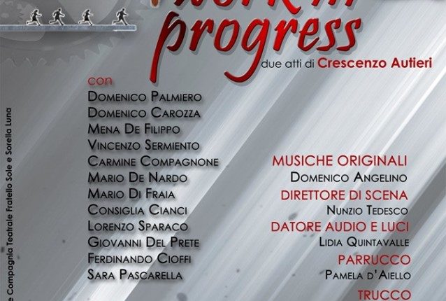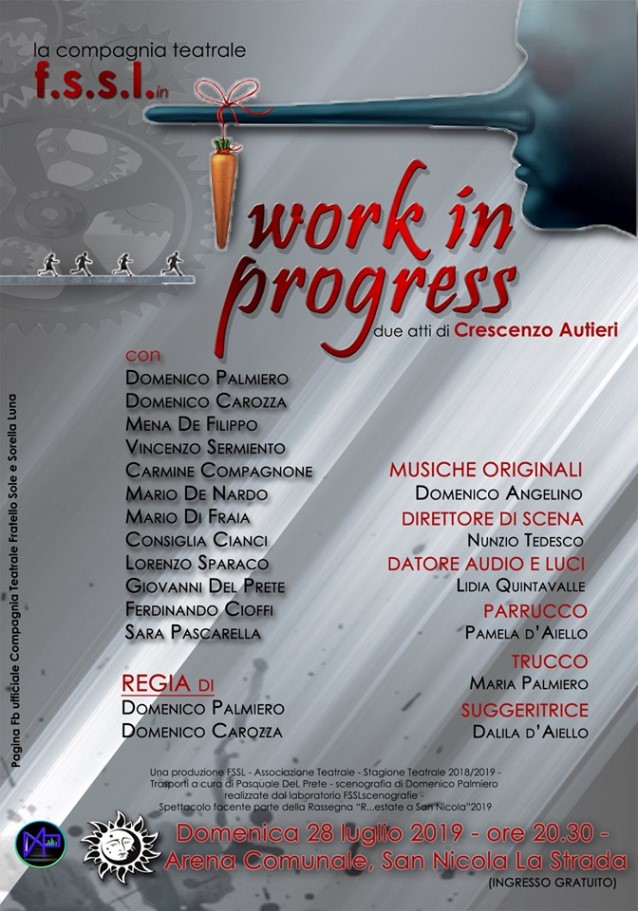 Con il patrocinio del Comune e la Pro Loco di San Nicola la Strada, lo spettacolo fa parte del programma della quarta edizione della rassegna teatrale estiva dal titolo: “R….Estate a San Nicola”. La Compagnia Teatrale “Fratello Sole e Sorella Luna” di San Marco Evangelista, dopo “Filumena Marturano” che ha chiuso brillantemente la scorsa stagione teatrale, è in scena domenica, 28 luglio 2019, alle ore 20.30, presso l’Arena Comunale “Ferdinando II” di San Nicola la Strada con la peace teatrale “WORK IN PROGRESS” due atti di Crescenzo AUTIERI, debuttato lo scorso 24 novembre 2019.