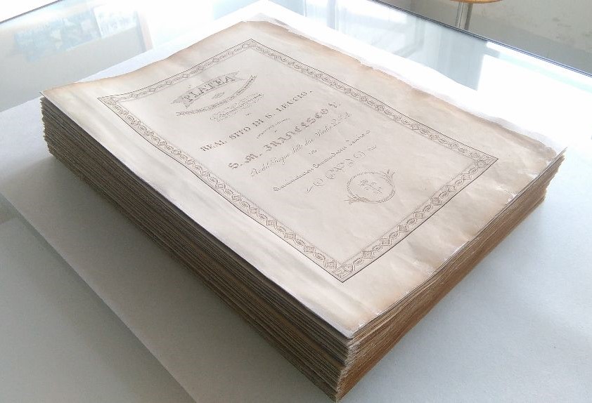 Il restauro si era reso necessario per poter manipolare e consultare nuovamente, e in sicurezza, l’opera, databile intorno al 1830. I danni più evidenti riguardavano il sistema di cucitura del volume, con conseguenti rotture del supporto cartaceo. L’intervento ha consentito di reintegrare gli strappi della carta, ridurre l’acidità dei media grafici e realizzare un nuovo sistema di cucitura con una nuova legatura.