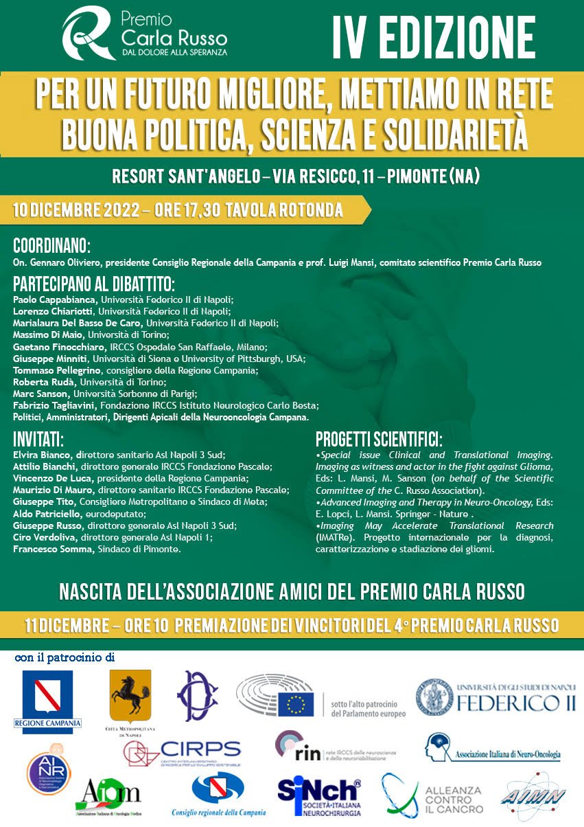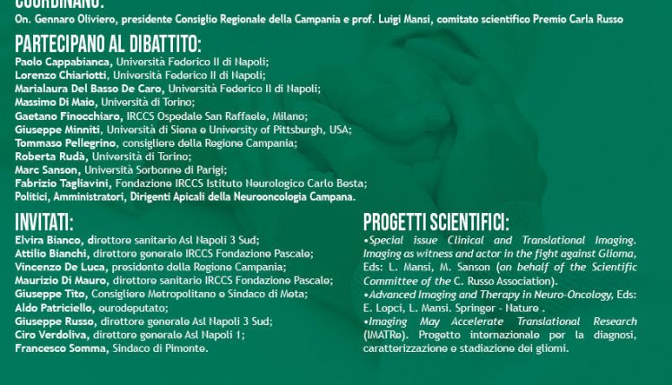 Luigi Mansi, coordinatore scientifico del Premio Carla Russo, ha invece delineato gli obiettivi che l’associazione si pone: “Il nostro scopo è quello di creare un network del bene, che metta insieme le azioni positive di quanti condividono speranze e passioni nella lotta ai tumori cerebrali, in grado di unire scienza, solidarietà, buona politica, ricercatori giovani e scienziati esperti. Nel 2019 lanciammo un seme in un campo martoriato dal dolore, che oggi comincia a maturare i primi frutti di livello internazionale”.