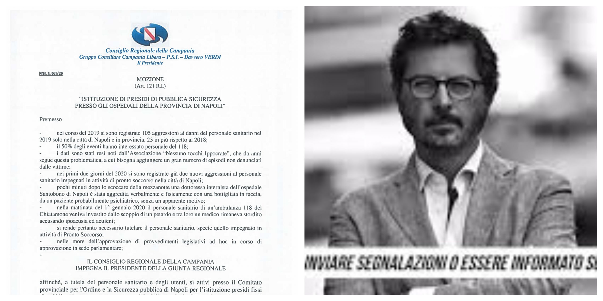 Anche i magistrati devono fare la loro parte ed essere più severi nei confronti di chi commette reati di teppismo e violenza nei confronti di chi opera negli ospedali o sulla autoambulanze del 118. Mi riferisco, ad esempio, alla recente assoluzione di un uomo che fratturò la mano ad un infermiere del Santobono con una stampella.” – dichiara il Consigliere Regionale dei Verdi e membro della commissione Sanità Francesco Emilio Borrelli che ha presentato l‘ordine del giorno in consiglio per chiedere al Prefetto e Questore di prevedere presidi delle forze dell’ordine nei pronto soccorso napoletani.