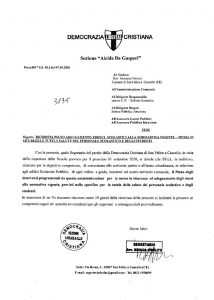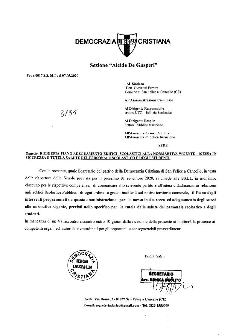 SAN FELICE A CANCELLO – Il Segretario cittadino della Democrazia Cristiana di San Felice a Cancello, Monica IPPOLITO, in data 7 maggio 2020, ha inviato una missiva al Sindaco del Comune di San Felice a Cancello, Giovanni Ferrara, a tutta l’Amministrazione comunale, al Dirigente del Settore UTC – Edilizia Scolastica, all’Assessore ai Lavori Pubblici ed all’Assessore alla Pubblica Istruzione, avente ad oggetto: