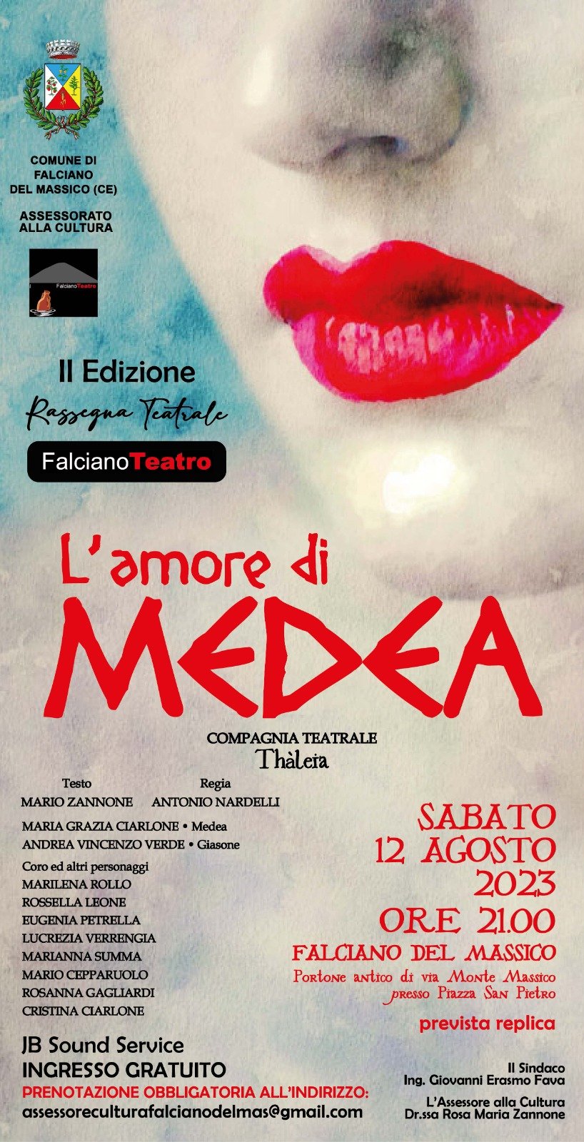 Il Comune di Falciano del Massico (CE) –Sindaco Ing. Giovanni Erasmo Fava– con l’Assessorato alla Cultura –coordinato dalla Dr.ssa Rosa Maria Zannone- è dunque lieto di invitare alla seconda edizione della rassegna teatrale per assistere alla pièce “L’ amore di Medea”, di cui è prevista una replica.