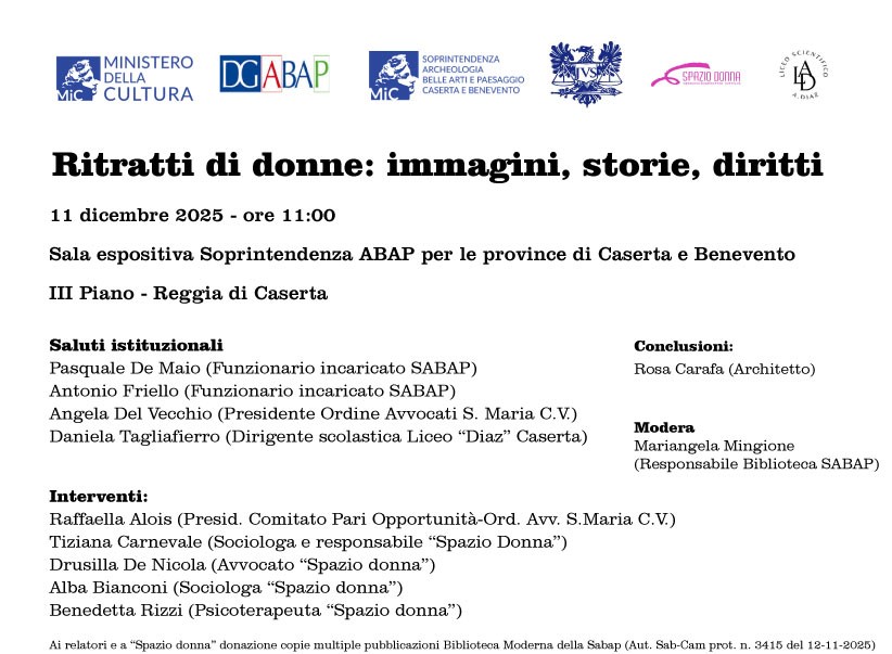 L’11 dicembre, dopo i saluti istituzionali dei funzionari incaricati della Soprintendenza Archeologia belle arti e paesaggio per le province di Caserta e Benevento Pasquale De Maio e Antonio Friello, della presidente del Consiglio dell’Ordine degli Avvocati di Santa Maria Capua Vetere Angela Del Vecchio e della dirigente scolastica del liceo scientifico “Armando Diaz” di Caserta Daniela Tagliafierro, prenderanno la parola, moderate dalla Responsabile della Biblioteca della Sabap Mariangela Mingione: Raffaella Alois, presidente del Comitato Pari Opportunità presso il Consiglio dell’Ordine degli Avvocati di Santa Maria Capua Vetere e quattro rappresentanti dell’associazione “Spazio Donna”, punto di riferimento per coloro che chiedono aiuto, la responsabile e sociologa Tiziana Carnevale, l’avvocato Drusilla De Nicola, la sociologa Alba Bianconi e la psicoterapeuta Benedetta Rizzi. Le conclusioni saranno affidate all’architetto Rosa Carafa, prima donna presidente dell’Ordine professionale casertano e prima donna in Italia a guidare un albo specialistico.
