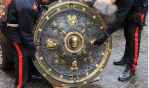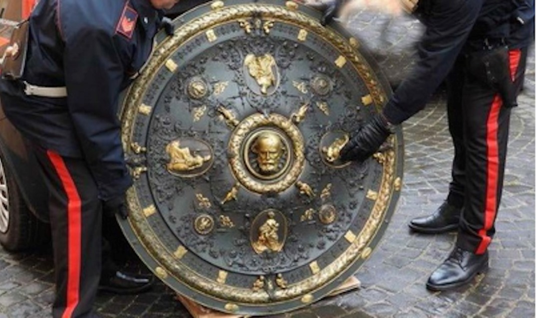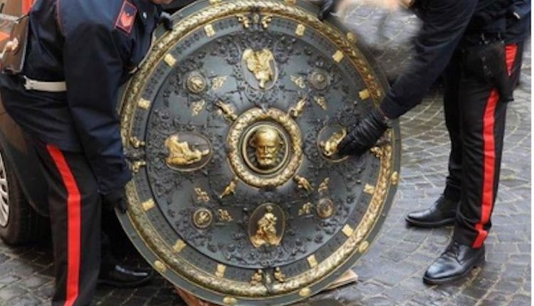CASERTA – I Carabinieri del Reparto Operativo Tutela Patrimonio Culturale e della Stazione di Roma Gianicolense hanno recuperato, nel corso della giornata di giovedì 19 gennaio 2019, lo “scudo di Garibaldi”, che il popolo siciliano donò al “Leone di Caprera” l’11 maggio 1878, in segno di affetto e riconoscenza, dopo lo sbarco in Marsala. Si tratta di un’opera unica nel suo genere: una scultura bronzea policroma di forma circolare, del diametro di 118 cm e del peso di 50 kg, realizzata da Antonio Ximenes.