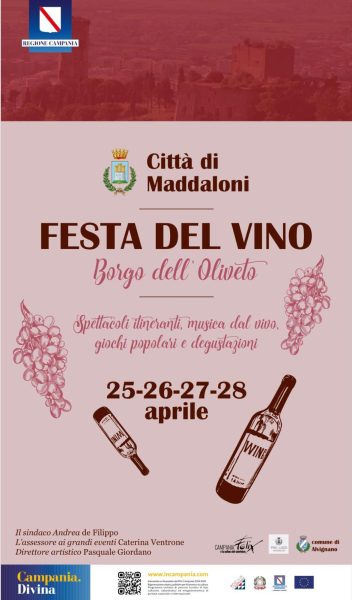 Maddaloni – Torna la festa del vino nel borgo dell’Oliveto. Sono pronti i quattro giorni di eventi a conclusione del POC Campania “Campania felix e la cultura del convivio”. Dopo il grande successo di partecipazione ai due convegni sul tema che si sono tenuti al Museo Civico, la manifestazione si sposta tra le caratteristiche strade e i portoni antichi del borgo dell’Oliveto, uno dei quartieri più antichi e suggestivi di Maddaloni, dove ormai questa festa è una tradizione attesa e consolidata.