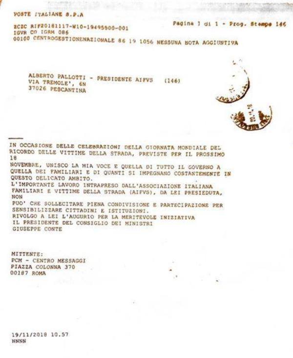 Il presidente del consiglio dei ministri, Giuseppe Conte, infatti, in una lettera posta all’attenzione del presidente Alberto Pallotti, in occasione delle celebrazioni della giornata mondiale delle vittime della strada, ha unito la sua voce, unitamente a tutto il Governo, “a quella dei familiari e di quanti si impegnano costantemente in questo delicato ambito. L’importante lavoro intrapreso dall’associazione Italiana Familiari e Vittime della Strada (A.I.F.V.S.) da lei presieduta, non può che sollecitare piena condivisione e partecipazione per sensibilizzare i cittadini e le istituzioni. Rivolgo a lei l’augurio per la meritevole iniziativa”.