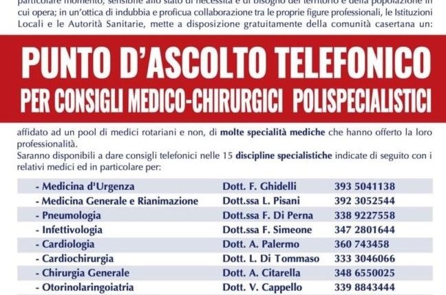 Con l’attivazione di questo servizio telefonico si intende offrire gratuitamente alla cittadinanza informazioni utili, consigli e la possibilità di poter far riferimento in caso di necessità ai medici, soci del Rotary Club casertano, che hanno dato la propria disponibilità mettendo in campo la loro professionalità.
