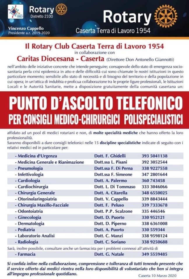 (g.l.) CASERTA – Il Rotary Club Caserta Terra di Lavoro 1954 nella persona del presidente Vincenzo Cappello, in collaborazione con Caritas Diocesana – Caserta, diretta da don Antonello Giannotti, nell’ambito delle iniziative concrete che intende perseguire, consapevole dello stato di emergenza socio-sanitaria per la crisi epidemica in atto e delle difficoltà cui sono chiamate le nostre istituzioni in questo particolare momento di emergenza sanitaria per l’epidemia da Covid-19, in sinergia con le Istituzioni locali, le Autorità sanitarie e il consenso dei propri associati, mette a disposizione della comunità di Caserta un punto di ascolto e consulenza telefonica medico-chirurgica polispecialistica.