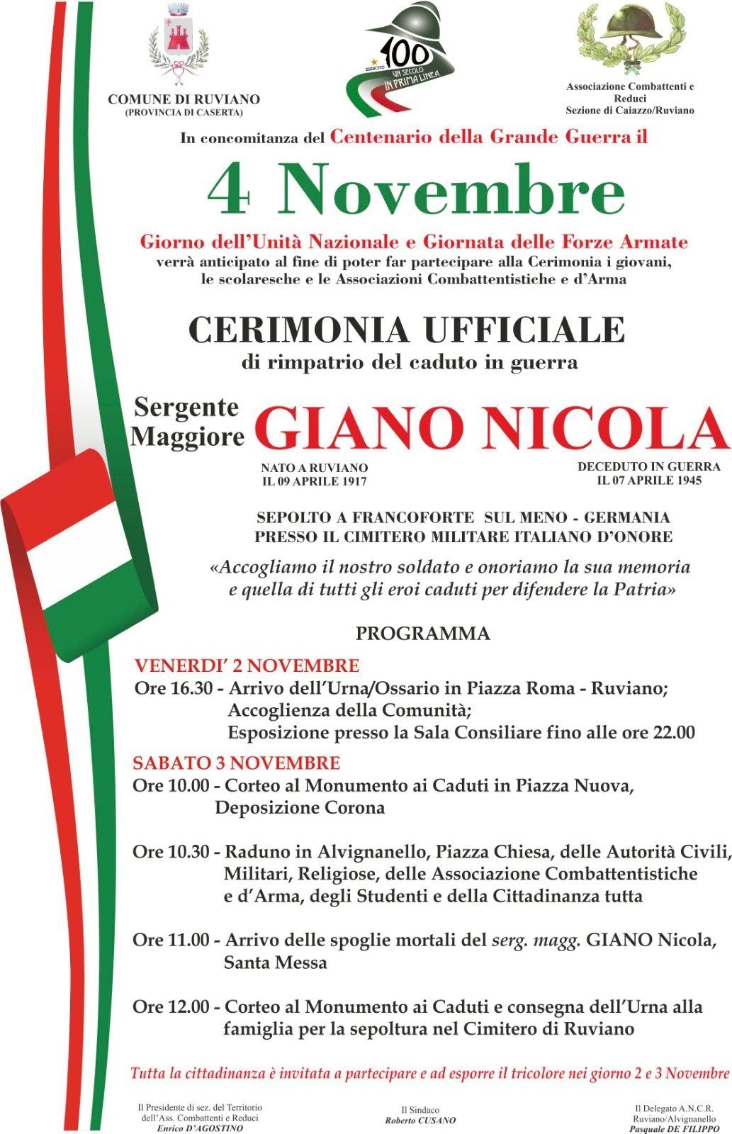 . Le sue spoglie ritornano in paese dopo 73 anni, e per lui sono previsti gli onori dovuti nella cerimonia di accoglienza fissata il 2 novembre alle 16.30, in piazza, e poi presso la Casa comunale. A farsi promotori dell’iniziativa la nipote del soldato Maria Grazia Giano, l’Associazione Combattenti e Reduci di Caiazzo/Ruviano guidata da Enrico D’Agostino, quella locale di Alvignanello (frazione di Ruviano) guidata da Pasquale De Filippo con il supporto morale ed economico dell’Amministrazione comunale del piccolo comune guidata dal sindaco Roberto Cusano. Nicola, nato il 9 aprile 1917, fu maestro di scuola; dopo il servizio militare fu richiamato in guerra nell’XI Reggimento Fanteria “Casale”, VI^ Compagnia di Forlì sul fronte greco-albanese con il grado di Sergente Maggiore. I terribili fatti che seguirono la data dell’Armistizio, l’8 settembre 1943, furono anche per lui motivo di dolore e sofferenza: fatto prigioniero dai tedeschi, venne deportato nel Lager VI F di Bocholt, Westfalen (Germania) con il numero di matricola 77459. Di lui, in famiglia, giunsero diverse lettere che ancora oggi testimoniano da un lato l’attaccamento alla vita e la vivacità di un giovane a quella età, dall’altro l’avanzare della sofferenza interiore, della paura di non poter tornare a casa e rivedere i propri cari, la propria terra d’origine. E così avvenne per il caro e giovane Nicola, di cui non giunsero più righe dal luglio 1944. Morì, vinto dagli stenti, il 7 aprile 1945. Il suo corpo venne trasferito nel cimitero di prima sepoltura a Castrop-Rauxel Stadt. Friedhof Bladenhorst e poi, come tanti altri soldati, nel Cimitero italiano d’onore di Francoforte sul Meno, riquadro N, fila 7, tomba 30. Ritorna a casa Nicola, e dopo lunghi anni il suo desiderio di essere nel luogo di nascita gli viene esaudito; e si fa portatore di grandi valori: la pace, il sacrificio, il senso del dovere, il rispetto per i luoghi cari. Le sue parole, scritte allora, risuonano ancora forti e immaginiamo di poterle destinare ai suoi coetanei di oggi. Sabato 3 novembre 2018, l’urna con i resti del giovane soldato sarà trasferita nella chiesa di Sant’Andrea nella frazione di Alvignanello per la celebrazione della messa, alle 11.00; poi sarà affidata alla famiglia per la tumulazione nel cimitero di Ruviano.