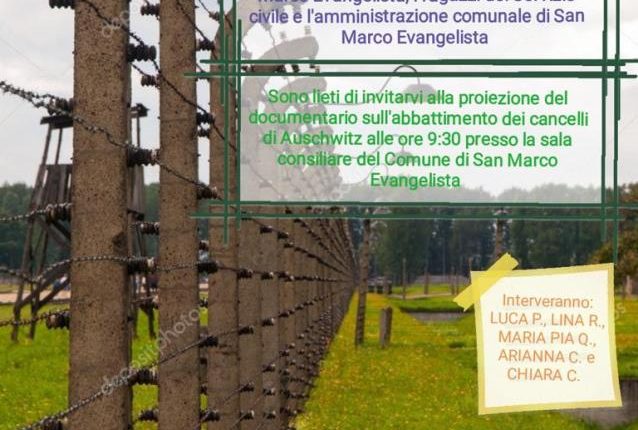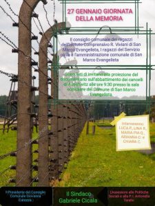 SAN MARCO EVANGELISTA (Nunzio De Pinto) – Lunedì, 27 gennaio 2020, con inizio alle ore 9:30, presso la Sala consiliare, i giovani del Consiglio comunale dei Ragazzi dell’Istituto Comprensivo “Raffaele Viviani” di San Marco Evangelista, unitamente ai ragazzi del Servizio Civile Nazionale, il Presidente del Consiglio Giovanna CAROZZA, l’Assessore alla P.I. ed alle Politiche Sociali Antonella TARALLO, ed il Sindaco Gabriele CICALA, hanno commemorato la memoria dei milioni di ebrei sterminati nei campi di concentramento nazisti.