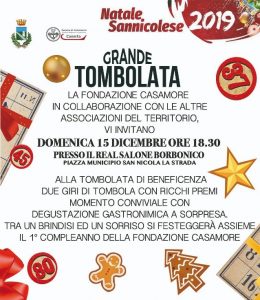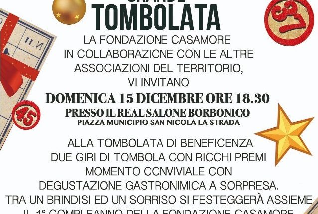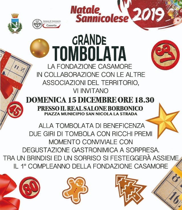 SAN NICOLA LA STRADA – Proseguono incessanti le iniziative del “Natale sannicolese 2019”, iniziate lo scorso 4 dicembre e che si concluderanno il 6 gennaio 2020. Nell’ambito delle iniziative, domenica 15 dicembre 2019, con inizio alle ore 18:30, presso il Real Salone Borbonico in Piazza Municipio, si terrà la “Grande Tombolata” a cura della Fondazione Onlus “Casamore” che festeggerà nell’occasione il primo anniversario della sua fondazione.