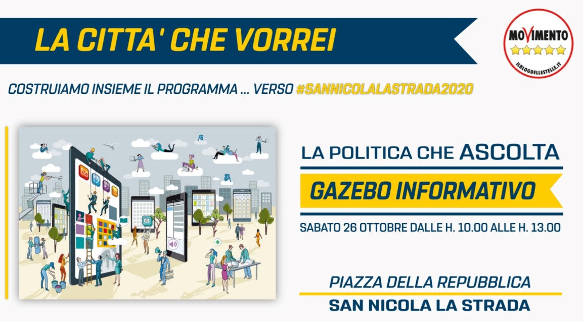 Il gruppo a San Nicola la Strada è al momento impegnato nella stesura del programma per le prossime amministrative, incontrando la cittadinanza, le associazioni e chi altri voglia fornire un contributo con le proprie idee. Solo dopo tale fase si procederà alla composizione di Sindaco, assessori e candidati consiglieri. Proprio per questo motivo, sabato mattina, 26 ottobre 2019, dalla ore 10:00 alle ore 13:30, il M5s ha allestito un gazebo in Piazza della Repubblica, là dove sono nati, dove hanno incontrato decine di cittadini ed hanno spiegato cosa hanno intenzione di proporre per la Città. Il M5s sannicolese sarà presente alla competizione elettorale e darà il proprio fattivo contributo affinché possa migliorare la qualità di vita nella nostra Città, soprattutto sotto il profilo ambientale, una competizione che teme di affrontare perché le troppe delusioni delle precedenti ed attuale classe politica hanno scaturito nei cittadini una reazione d’orgoglio.