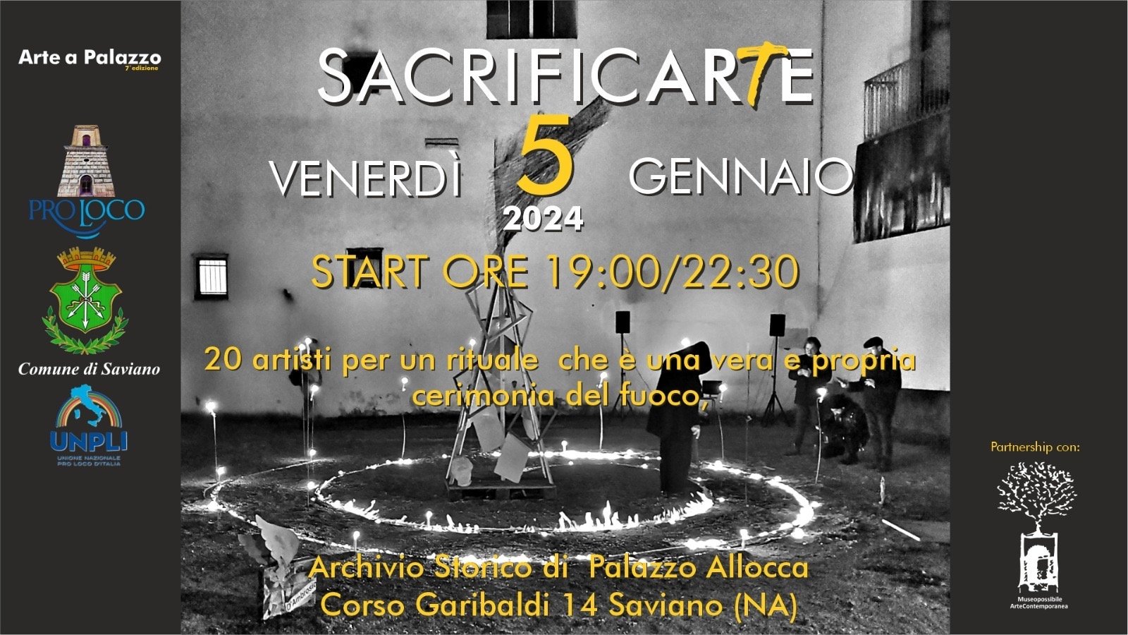 Come ogni anno, a partire dal 2019, anche quest’anno l’arte accoglierà la nuova annata e celebrerà il ciclo vita-morte-vita con l’evento artistico/alchemico “Sacrificarte”, curato da Carmine Ciccone, con il Comune di Saviano, la Pro Loco ‘Il Campanile’ di Saviano e con la partnership di Museopossibile ArteContemporanea avrà luogo venerdì 5 gennaio 2024, a partire dalle ore 18,30 fino alle 22,30, nella corte e nel giardino dello storico Palazzo Allocca di Saviano.