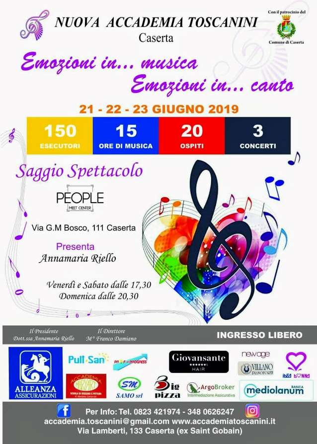 La Nuova Accademia Toscanini, diretta dal M° Franco Damiano, presenta per la chiusura dell anno accademico 2018/2019 il Saggio – Spettacolo nei giorni 21,22,23 Giugno 2019 presso la Sala Meet Center People di Caserta. Sul palcoscenico si esibiranno 150 esecutori, con oltre 15 ore di Musica e tantissimi ospiti. Venerdì 21 giugno 2019 lo spettacolo si aprirà con le voci del piccolo coro della Toscanini , seguiranno poi le esibizioni dei più piccoli allievi dell’Accademia per i diversi corsi, tra cui il Pianoforte, il violino, la chitarra, il canto. Il palco vedrà ospiti i ballerini della scuola di danza Newage di Caserta, diretti dal M° Vincenzo Cirillo.
