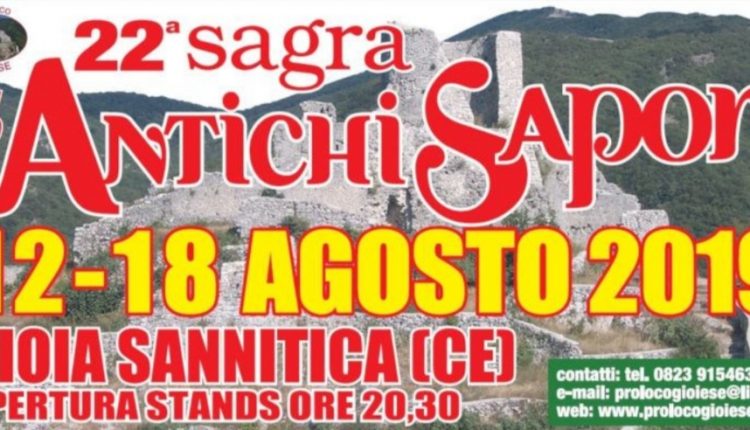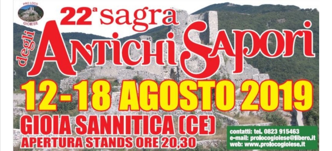 Anche quest’ anno si terrà la tradizionale e tanto attesa Sagra degli antichi sapori, a Gioia Sannitica, in provincia di Caserta al confine con il beneventano. Giunta alla 22ma edizione ed organizzata dalla Pro Loco Gioiese, la manifestazione durerà dal 12 al 18 agosto con apertura stand alle 20:30. Anche quest’ anno ampia varietà di piatti ottimamente preparati ed oltre 1000 posti a sedere.