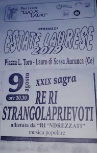 Lauro di Sessa Aurunca. Il giorno 9 agosto dalle ore 20.30 c’è la sagra degli strozzapreti a Lauro di Sessa Aurunca, organizzata per un giorno soltanto.