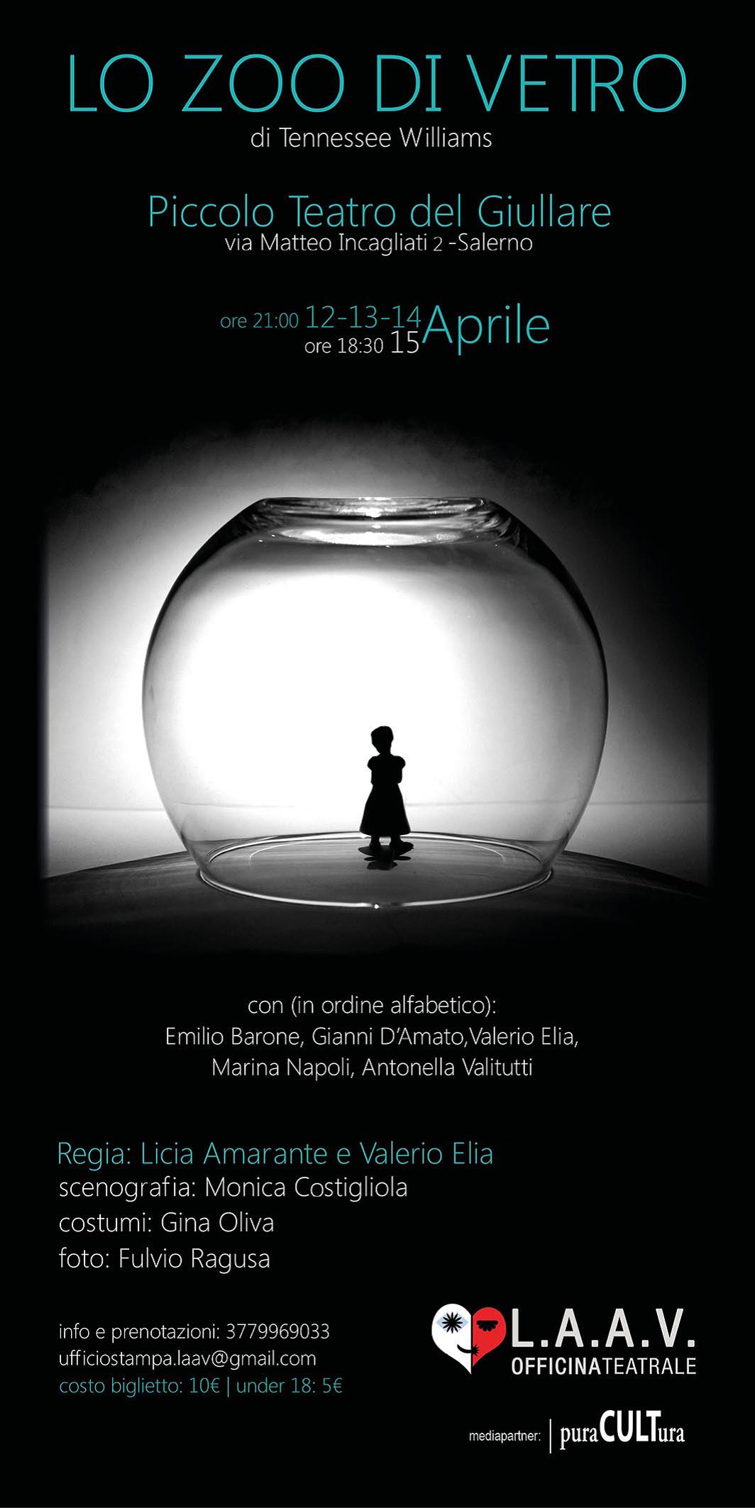 SALERNO – Giovedì 12 aprile 2018, con inizio alle ore 21.00, debutta al Teatro del Giullare (via Vernieri, trav. Incagliati – Salerno) la nuova produzione di L.A.A.V. Officina Teatrale “Lo zoo di vetro” di Tennessee Williams, nella traduzione di Gerardo Guerrieri. Il dramma in due atti, che vede in scena Antonella Valitutti, Emilio Barone, Gianni D’Amato, Marina Napoli e Valerio Elia, ha la regia di Licia Amarante e Valerio Elia. Scenografia di Monica Costigliola ed Angelo de Tommaso, costumi Gina Oliva, foto Fulvio Ragusa. “Il dramma è memoria, quindi irreale: la memoria si concede molte licenze poetiche, omette particolari e altri ne esagera a seconda dei valori emotivi degli oggetti sui quali si posa”. Lo spettacolo inizia e finisce con le stesse parole, con la stessa immagine: il riflesso di pezzi di vetro. È un singolo istante che penetra con forza nell’Io di Tom e vivifica il ricordo del suo passato familiare, quello da cui è fuggito. Prende forma una dimensione psichica entro cui è il protagonista stesso a ricostruire il ricordo, a plasmare la proiezione di un mondo che non è quello reale, ma quello vissuto: l’immagine della sua casa si distorce fino a ridursi alle trasparenti geometrie della scenografia entro cui vivono non personaggi, ma fantasmi artefatti di un passato rimosso, mai del tutto. Un padre la cui assenza si fa palpabile, visibile, che domina quel che resta delle relazioni domestiche penetrando in altre forme nella vita della famiglia che ha abbandonato. Amanda, una madre asfissiante, legata all’illusione di ciò che le rimane; Laura, una sorella bisognosa di un affetto troppo più grande di quello che Tom può darle. È Laura il centro di tutto, è lei che costruisce quel mondo simbolico fatto di piccoli animali di vetro, che riflettono identità frammentate, riempiendo la scena di una ambigua vitalità.