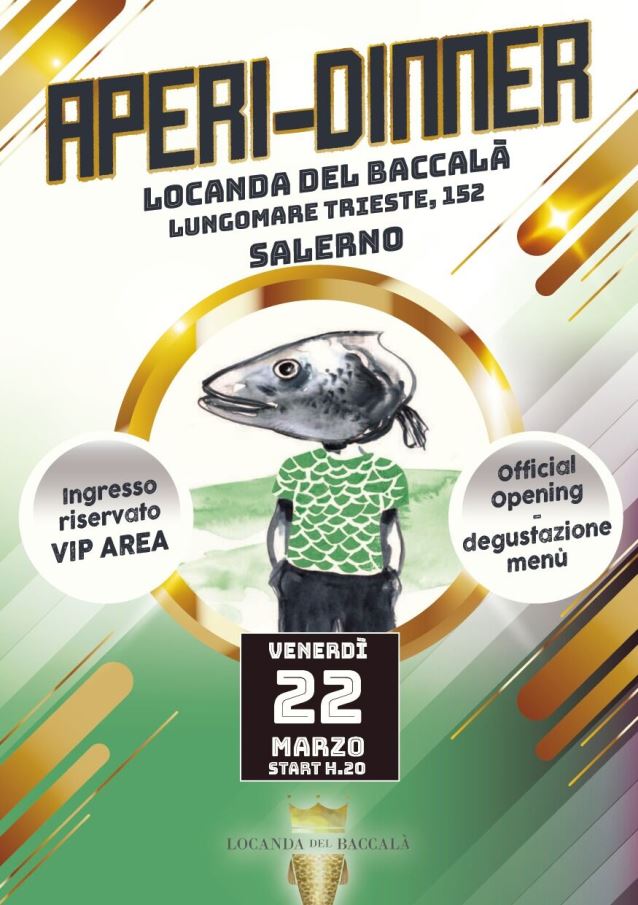 SALERNO – Venerdì 22 marzo 2019, la Locanda del Baccalà di Salerno apre le porte ad un evento riservato, dedicato alla stampa e al mondo della cultura e dello spettacolo salernitano: un “aperi-dinner” a base di pesce e vino, con degustazione completa del menù della locanda, in stile finger food. Dalle ore 20.00 in poi, antipasti, fritti, polpette, primi piatti, portate tipiche e creazioni dello chef.