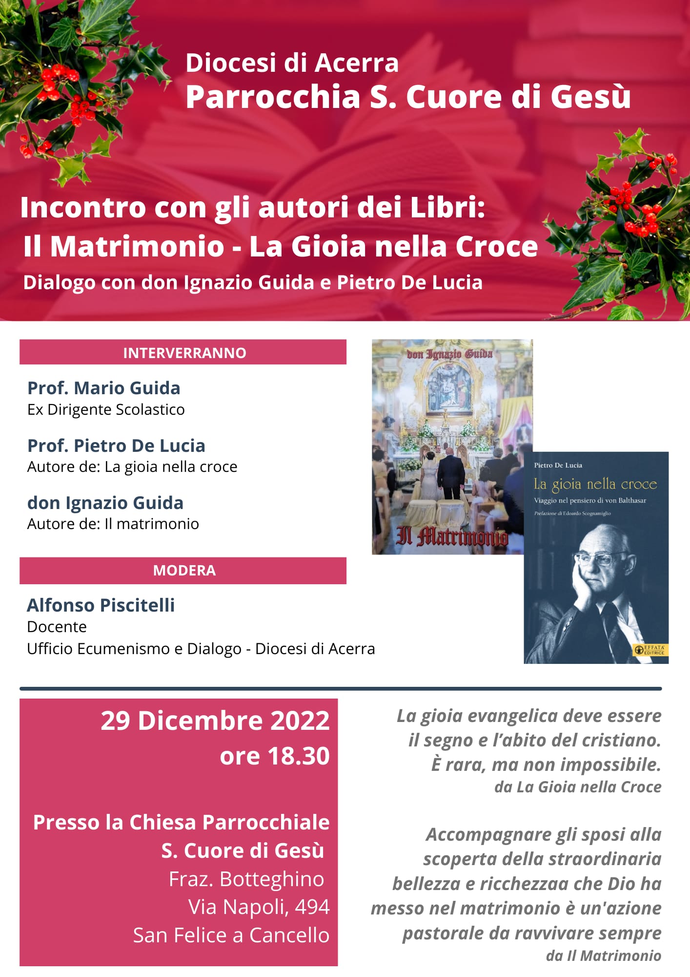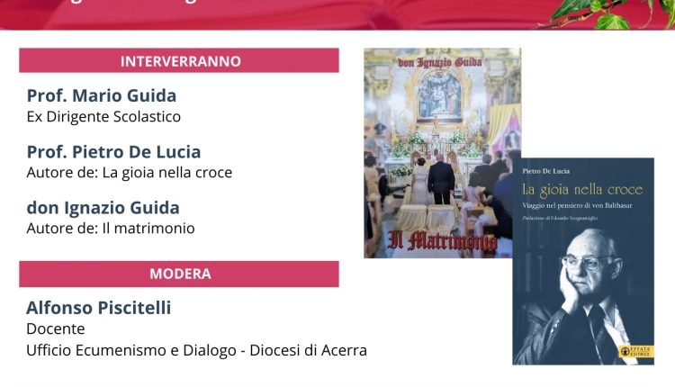 SAN FELICE A CANCELLO (Caserta) – Presso la chiesa parrocchiale del “Sacro Cuore di Gesù” in San Felice a Cancello, frazione Botteghino” il prossimo 29 dicembre 2022 alle ore 18.30 si terrà una duplice presentazione di libri. L’evento organizzato con il patrocinio della Diocesi di Acerra prevede la presentazione dei libri “Il Matrimonio” e “la Gioia nella Croce” con relativo intervento e dialogo con don Ignazio Guida, autore del primo libro, e il prof. Pietro De Lucia, autore del secondo libro. Interverrà con loro anche l’ex Dirigente Scolastico prof. Mario Guida. La serata sarà moderata da prof. Alfonso Piscitelli dell’Ufficio Ecumenico e Dialogo della Diocesi di Acerra.