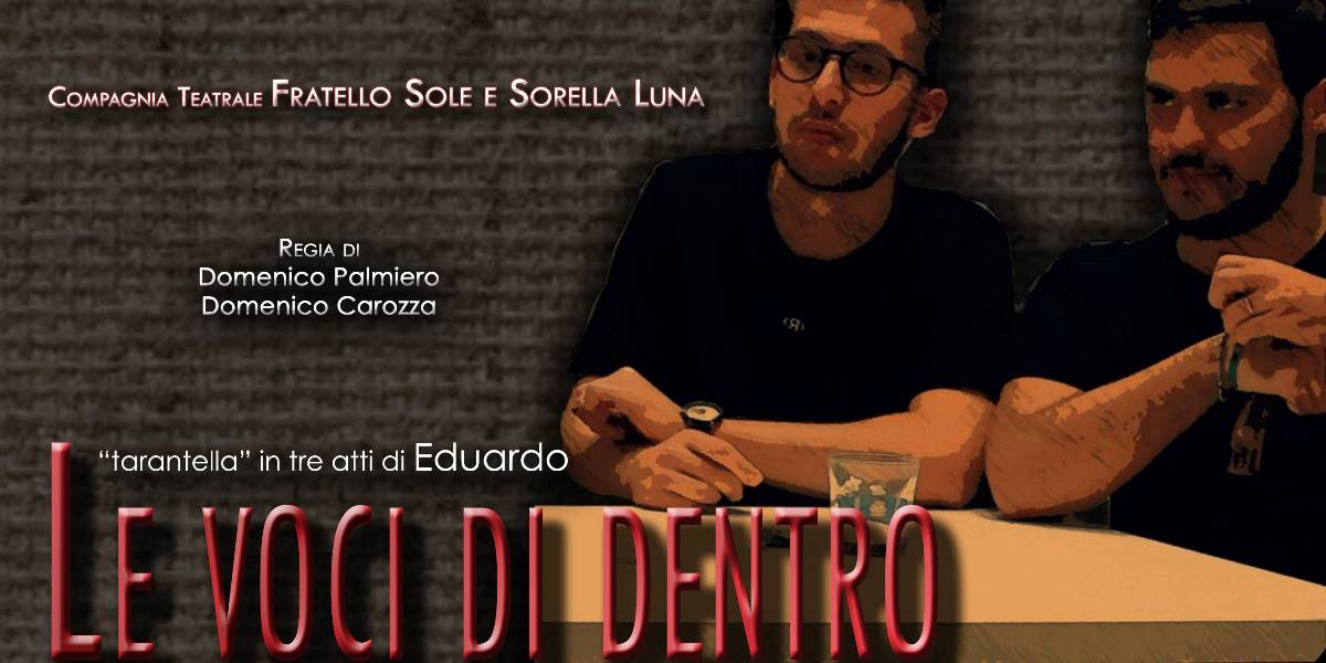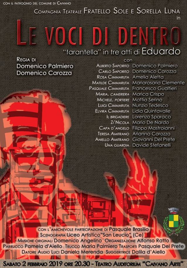 SAN MARCO EVANGELISTA – La Compagnia Teatrale “Fratello Sole e Sorella Luna” di San Marco Evangelista, dopo il successo ottenuto con “Filumena Marturano”, ritorna all’Auditorium “Caivano Arte” dove sabato 2 febbraio 2019, con inizio alle ore 20.30, debutterà con “Le voci di dentro”, tarantella in tre atti di Eduardo De Filippo, per la regia di Domenico Palmiero e Domenico Carozza. Gli attori della pièce teatrale sono: con Domenico Palmiero, Domenico Carozza, Amelia Aletta, Mariarosaria Clemente, Francesco Gualtieri, Marica Crispo, Mattia Serino, Nunzio Tedesco, Lidia Quintavalle, Lorenzo Sparaco, Mario De Nardo, Filippo Mastroianni, Arianna Carozza, Giovanni Del Prete, Davide Stefanelli e con l’amichevole partecipazione di Pasquale Brasilio.