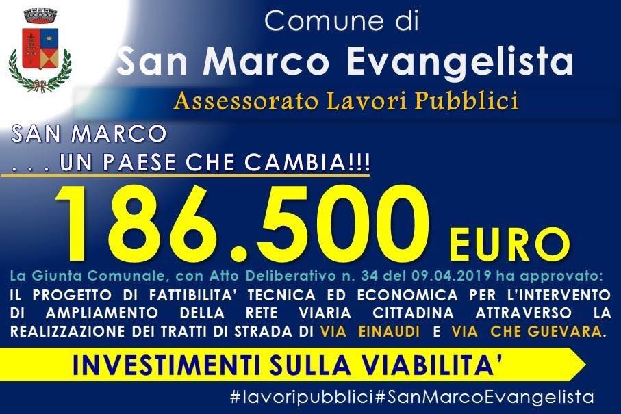 SAN MARCO EVANGELISTA – Su proposta dell’Assessore ai Lavori Pubblici Giovanni Vagliviello, l’Esecutivo cittadino ha approvato la deliberazione nr. 34 del 9 aprile 2019 avente per oggetto: “Progetto di Fattibilità Tecnica ed Economica per “Intervento di ampliamento della rete viaria cittadina attraverso la realizzazione dei tratti di strada di via Einaudi e via Che Guevara”. Con deliberazione di G.C. nr. 76 del 08/10/2015, la Giunta guidata dal Sindaco Gabriele Cicala, ha adottata la proposta di Piano Urbanistico Comunale e nell’ambito del suindicato P.U.C. sono state previste alcune aree destinate ad incrementare la carente dotazione di infrastrutture primarie del territorio comunale.