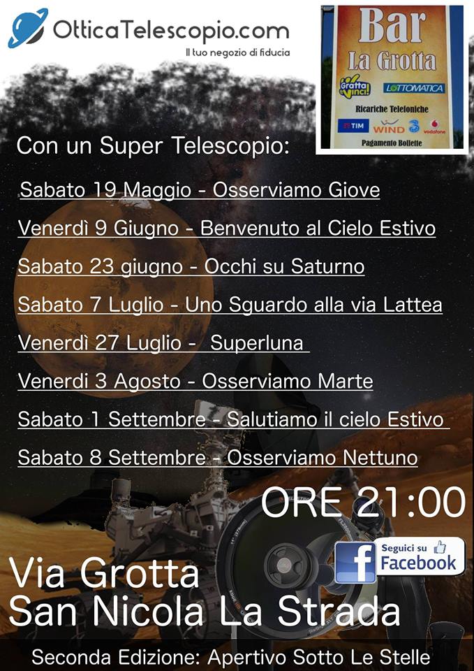 SAN NICOLA LA STRADA – Da molto tempo in Città non si guardano più le stelle col telescopio. Ma per il secondo anno consecutivo Stefano Letizia della “Ottica Telescopio” sita in via Cairoli ha organizzato 8 serate dedicate al cielo stellato, con osservazione al telescopio e diretta live, e sarà possibile fotografare quello che si sta osservando e osservare i pianeti, la luna, stelle doppie e tanto altro. Stefano Letizia ha organizzato le 8 serata presso il “Bar la Grotta” in Via Grotta. Ottica telescopio mette a disposizione uno o più telescopi per organizzare queste otto serate, ma anche per feste o eventi.  È possibile affittare (noleggiare ) telescopi di ultima generazione e dal grande diametro con sistema di puntamento automatico per organizzare eventi didattici, serate astronomiche o anche per feste private come comunioni, cresime e matrimoni per rendere ancor più speciale il giorno di festa. Sarà possibile fare osservazione al telescopio o anche foto speciali da incorniciare.  Ottica Telescopio è un azienda che prende il nome dalla fantasia e dalla passione dell’amministratore della società Satelliti e Multimedia SAS, e questo sito nasce dalla passione per l’astronomia e dell’osservazione del cielo stellato. Una passione di un bambino trasformata in un lavoro che non mira solo alla vendita ma anche alla divulgazione astronomica. Presso il negozio o shop online è possibile trovare telescopi dobson, newton, mak, rifrattori, schmidt cassegrain sia solo ota ( tubo ottico ) o telescopio completo di montatura e accessori. Potete acquistare a prezzi in offerta sia il vostro primo telescopio (telescopi per principianti ) o uno strumento per utenti avanzati o perchè no, aggiornare quello che già avete potenziandolo con accessori o con una nuova montatura. L’azienda di Stefano Letizia è sul mercato 12 anni di commercio prima nato solo con un negozio fisico con il nome “Grafica & Multimedia” per poi espandersi, viste le nuove richieste ed esigenze dei clienti, con il nome “Satelliti e Multimedia SAS” ed  anche online con un sito di e-commerce. L’Azienda è presente anche sui canali di vendita più famosi. La prima delle otto serate a tema prenderà il via sabato 19 maggio 2018 dalle ore 21.00 ed ha per tema: “Osserviamo Giove”, e prosegue venerdì 9 giugno 2018 ore 21.00 con il tema: “Benvenuto al cielo estivo”; sabato 23 giugno 2018 ore 21.00 “Occhi su Saturno”; sabato 7 luglio 2018 ore 21.00 “Uno sguardo alla via Lattea”; venerdì 27 luglio 2018 ore 21.00 “Superluna”; venerdì 3 agosto 2018 ore 21.00 “Osserviamo Marte”; sabato 1 settembre 2018 ore 21.00 “Salutiamo il cielo estivo”; sabato 8 settembre 2018 ore 21.00 “Osserviamo Nettuno”.