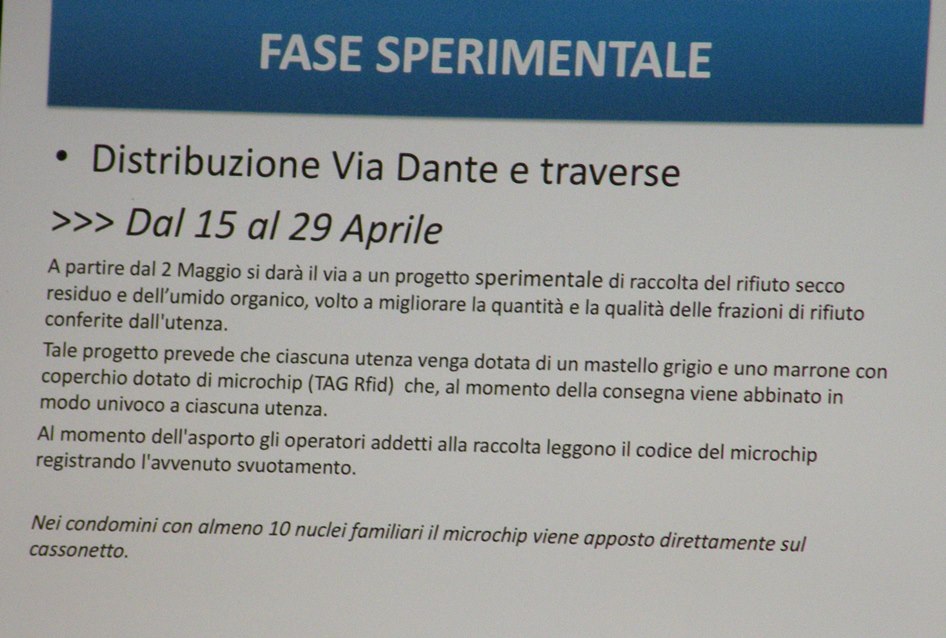 Il progetto sperimentale pilota interessa al momento i residenti di via Dante, via Toti, via Foscolo, via Kennedy, via Volta e Viale Lincoln, e parte dal 2 maggio 2019. Nel frattempo, a partire del 15 al 29 aprile 2019 i residenti delle strade interessate saranno contattati tramite posta per andare a ritirare presso l’Ecosportello di Via Diaz il Kit per l’umido e la differenziata. Il Kit comprende due “Mastelli” ( o cestelli che dir si voglia); uno di colore “marrone” per l’umido, l’altro di colore “grigio” per l’indifferenziato. I predetti mastelli hanno il coperchio dotato di MICROCHIP (TAG Rfid) che, al momento della consegna viene abbinato in modo UNIVOVO a ciascun NUCLEO FAMIGLIARE.