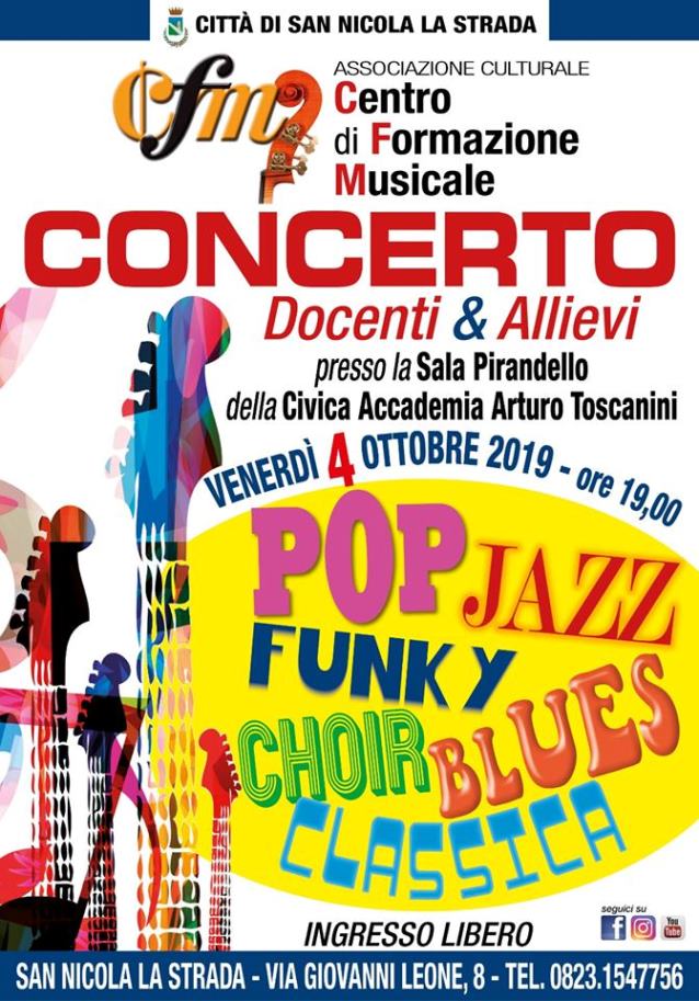 SAN NICOLA LA STRADA – Il Maestro Bruno PERSICO, legale rappresentante dell’Associazione “Centro di Formazione Musicale”, lo aveva pubblicamente annunciato già nel corso della conferenza stampa che si è tenuta il 9 settembre 2019, presso la sede della Civica Accademia “Arturo Toscanini” in Via Giovanni Leone in San Nicola Strada, quando presentò i corsi musicali organizzati presso la predetta Civica Accademia Musicale: “….. Il prossimo 4 ottobre 2019 terremo un concerto, con ingresso libero, con docenti ed allievi presso la Sala Pirandello, dove presenteremo alla cittadinanza sannicolese i nostri professori di musica che si esibiranno nei diversi stili di musica: “Pop”, “Jazz”, “Funky”, “Choir”, “Blues”, “Classica”.