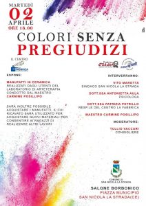 SAN NICOLA LA STRADA – Il 2 Aprile 2019 è la Giornata Mondiale della Consapevolezza dell’Autismo. Per questa occasione al Salone Borbonico di San Nicola la Strada, con inizio alle ore 18.00, in occasione del mese dedicato al disagio mentale, si terrà, grazie all’impegno della Cooperativa la Fabbrica – Cooperativa Sociale “Federico Ozanam”, una Mostra di Artisti Speciali denominata “Colori senza PREGIUDIZI”. All’evento seguirà anche una tavola rotonda alla quale interverrà il Sindaco Vito Marotta, la Psicologa dr.ssa Antonietta Aula, la Responsabile del Centro La Fabbrica dr.ssa Patrizia Petrillo ed il Maestro Carmine Posillipo. Modera il Consigliere comunale Tullio Vaccari.