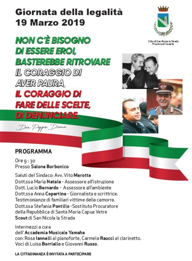 SAN NICOLA LA STRADA – Martedì 19 marzo 2019, presso il Salone Borbonico si terrà la Giornata della Legalità 2019 organizzata dall’Amministrazione comunale con una citazione di don Peppe Diana, il parroco di Casal di Principe ucciso per mano dei killer della camorra il 19 marzo 1994: “Non c’è bisogno di essere eroi, basterebbe ritrovare il coraggio di aver paura, il coraggio di fare delle scelte, de denunciare”. La Giornata della Legalità 2019 inizierà alle ore 9,30 con i saluti istituzionale del Sindaco Vito Marotta, a cui seguiranno gli interventi dell’Assessore all’Istruzione Maria Natale, dell’Assessore all’Ambiente Lucio Bernardo, della giornalista e scrittrice Anna Copertina, del Sostituto Procuratore della Repubblica di Santa Maria Capua Vetere dr.ssa Stefania Pontillo, il Gruppo Scout di San Nicola la Strada.