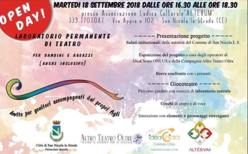 e al “Comitato Onlus IdeaChiara” per la presentazione del Laboratorio di teatro sociale per bambini e ragazzi. Tali associazioni, infatti, propongono l’avvio di un laboratorio di teatro sociale per bambini e ragazzi di un’età compresa fra i 3 e i 14 anni anche con finalità di inclusione, aperto a tutti i partecipanti, normodotati, con disagio economico, disagio familiare, nonché disabili e appartenenti alla comunità degli extracomunitari. Il progetto, che ha come finalità la promozione del benessere relazionale e comunicativo, sarà presentato martedì 18 settembre 2018 alle ore 16.30 presso la sede dell’Associazione Alterum in via Appia, 102 a San Nicola la Strada alla presenza dell’ assessore Maria Natale e del sindaco Vito Marotta.