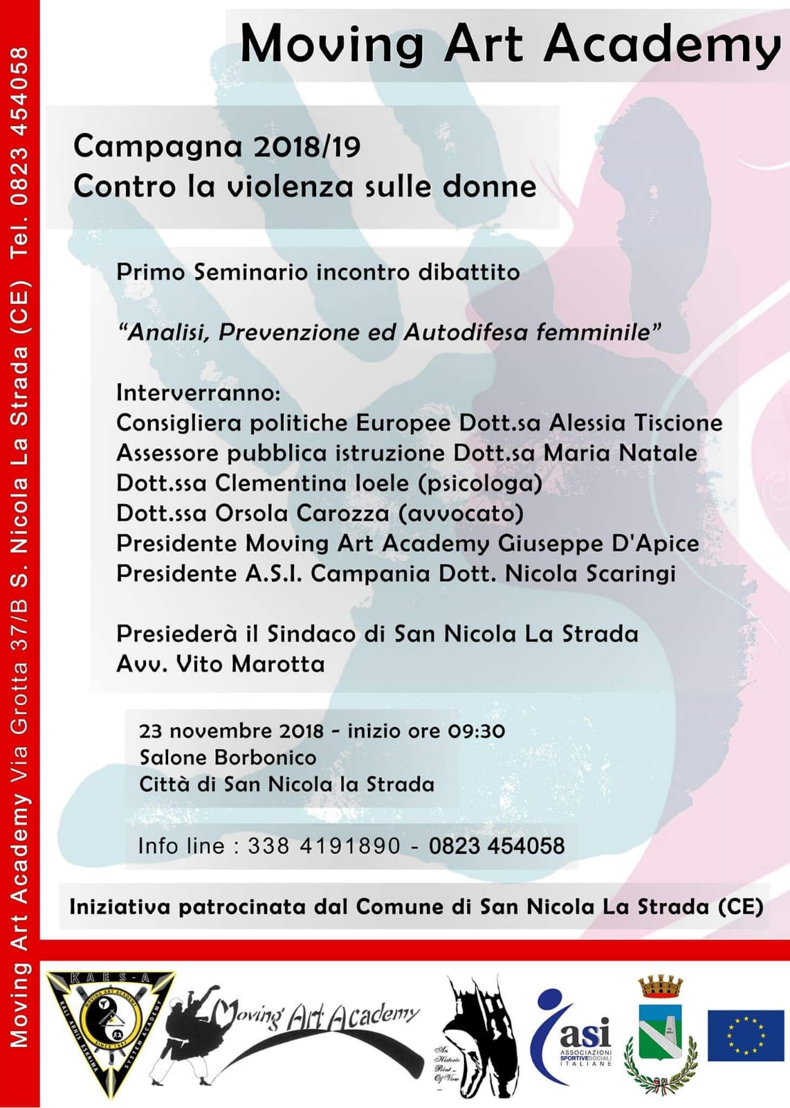 SAN NICOLA LA STRADA – Nell’occasione della Giornata Internazionale Contro la Violenza sulle Donne, l’associazione sportiva dilettantistica Moving Art Academy, con il patrocinio del Comune di San Nicola la Strada e del Comitato Regionale Asi della Campania organizza – venerdì 23 novembre 2018 presso il Salone Borbonico di San Nicola la Strada – il convegno Analisi, prevenzione ed autodifesa femminile.