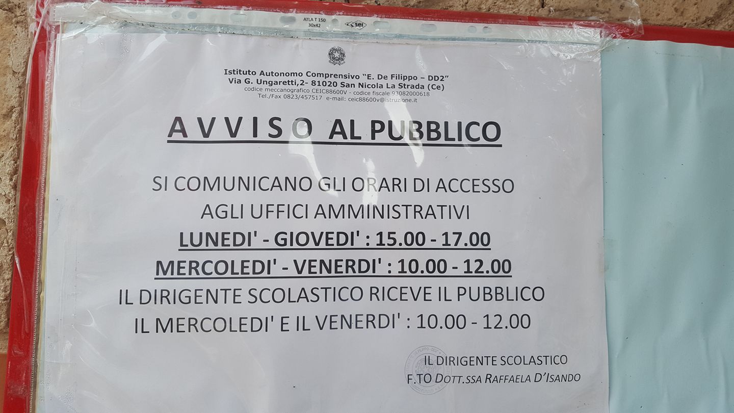 SAN NICOLA LA STRADA – Mancano poche ore all’avvio del nuovo anno scolastico 2017-2018 ed i genitori dei bambini che dovranno iniziare a frequentare gli istituti scolastici, in particolare coloro che hanno i figli che debbono andare alle scuole dell’infanzia, si fanno prendere dalla paura che i loro figli possano non essere ammessi a frequentare la scuola. Nella Città di San Nicola la Strada, la dirigente scolastica dell’Istituto Comprensivo “E. De Filippo – DD2”, professoressa Raffaela D’Isando, ha inviato al Sindaco Vito Marotta, a tutti i genitori, ai docenti, la nota prot. nr. 2974 C29 del 29 agosto 2017, con la quale ha avvisato le famiglie, con figli che frequentano servizi educativi per l’infanzia o scuole dell’infanzia (incluse quelle private non paritarie), che dovranno presentare la documentazione richiesta entro il 10 settembre 2017, mentre per chi ha figli iscritti alla scuola del I e II ciclo la documentazione va presentata entro il 31 ottobre 2017. La mancata presentazione della documentazione entro i termini previsti sarà comunque segnalata, entro i successivi 10 giorni, dal dirigente scolastico all’ASL territorialmente competente che, avvierà la procedura. Tale solerzia nel rispettare i dettami delle circolari ministeriali purtroppo non è identica a quella che si riscontra sul territorio cittadino. Infatti, lunedì 11 settembre 2017, sui social si è scatenato un putiferio in quanto diverse mamme, presentatesi fuori i cancelli della scuola, dopo aver preso un permesso dal posto di lavoro, non hanno potuto consegnare la certificazione e lo hanno denunciato pubblicamente sul web. “Poco fa” – ha scritto una di queste mamme – “io e un altro gruppo di genitori ci siamo recati alla segreteria dell’Istituto De Filippo per consegnare le famose autocertificazioni relative ai vaccini e, dopo varie citofonate insistenti, si è affacciata una signora che ci ha comunicato che la segreteria è chiusa perché nessuno si è presentato ad aprire. Noi abbiamo preso permessi a lavoro per adempiere al nostro dovere….ma il DOVERE del servizio pubblico da chi è controllato????? Vi consiglio di modificare il sottostante cartello con i seguenti orari: apertura a comodità del personale. Siamo in tanti qui fuori….sotto la pioggia in attesa di una spiegazione”. Il cartello a cui fa riferimento la mamma è molto chiaro e per questo motivo sono ancora più infuriate. Un’altra mamma ha aggiunto che due anni orsono erano intervenuti i Carabinieri e poi tutto è finito all’italiana, come se nulla fosse successo. Diciamo noi: “A tarallucci e vino”.