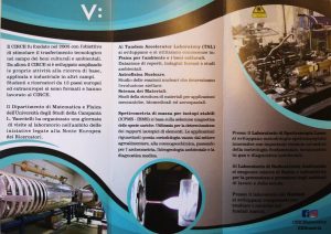 L’Open Day è articolato con visite guidate ai laboratori: “TAL” (Tandem Accelerator Laboratory) acceleratore di particelle da 3 milioni di Volt; “ICMPS-IRMS” laboratori di spettrometria di massa per isotopi stabili; “Laboratorio di Radioattività” (misure di Radon e di Radioattività ambientale); “Spettroscopia Laser” (tecnologia per determinare con estrema precisione grandezze e parametri che caratterizzano lo spettro di atomi e molecole); “Km3net” (rivelatore di neutrini).
