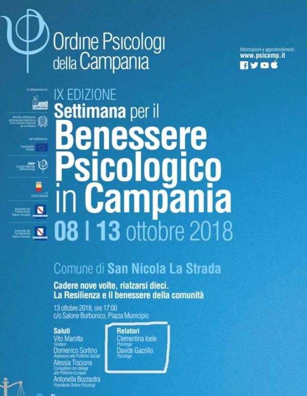SAN NICOLA LA STRADA – L’Amministrazione comunale, guidata dal Sindaco Vito Marotta, ha aderito alla IX^ edizione della “Settimana per il benessere psicologico in Campania” organizzata dall’Ordine degli Psicologi. In tutta la Regione gli studi dei professionisti sono aperti gratuitamente dall’8 al 13 ottobre 2018, per accogliere coloro i quali vogliono fermarsi un momento e prendersi cura di sé. Dal 8 al 13 ottobre il tema della resilienza sarà declinato nei circa 400 incontri organizzati dagli psicologi in 70 Comuni e 200 scuole della regione. Si conferma la collaborazione con l’Anci Campania, l’Ufficio scolastico regionale e con l’assessorato regionale alle Politiche sociali. La rete sociale creata negli anni si allarga coinvolgendo, per la prima volta, 25 Ordini professionali, nell’ottica di promozione del dialogo e dello scambio di competenze tra professionisti per creare opportunità di sviluppo per la comunità. I giovani che restano in una realtà complessa e provano a reinventarsi o quelli che scelgono di andare via sperando in un futuro migliore. I cittadini colpiti da catastrofi naturali che, nelle difficoltà, cercano di ricostruire le proprie vite. I disoccupati e i lavoratori precari che lottano in cerca di maggiore stabilità. Le imprese che resistono alle crisi adattandosi ai nuovi mercati valorizzando il capitale umano. Sono alcuni esempi di resilienza, la capacità di affrontare e superare le difficoltà e riorganizzare positivamente il proprio vissuto. Sarà questo il tema al centro della IX^ edizione della Settimana del benessere psicologico, l’evento organizzato dall’Ordine degli Psicologi della Campania che venerdì, 13 ottobre 2018, nel Salone delle Conferenze del Real Convitto Borbonico di San Nicola la Strada terrà un convegno dal titolo: “Cadere nove, rialzarsi dieci. La Resilienza e il benessere della comunità”. Dopo i saluti del sindaco Vito Marotta e della Presidente dell’Ordine dei Psicologi Antonella Bozzaotra