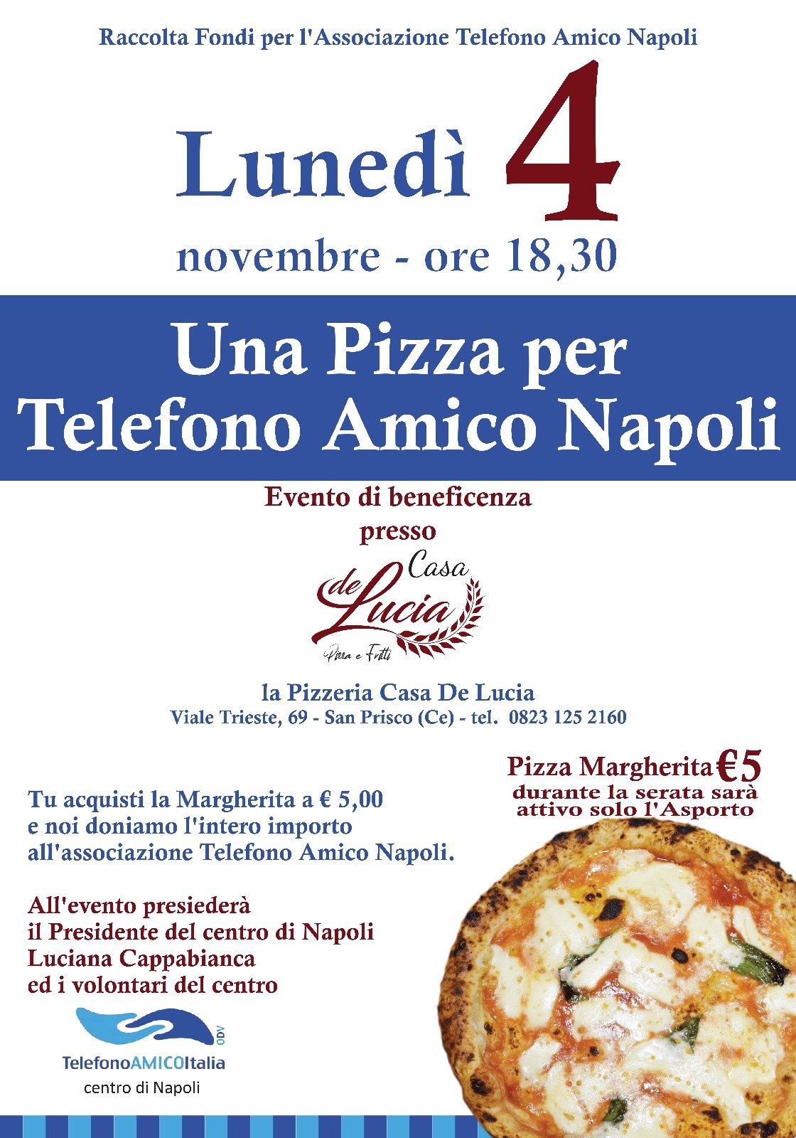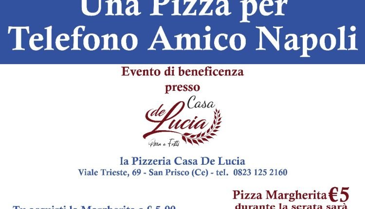 “Telefono Amico Italia dà a chiunque la possibilità di esprimere la propria sofferenza in modo anonimo e confidenziale, permettendo ad ogni individuo di recuperare la propria storia e il proprio senso all’interno della società”. E’ quanto si legge alla voce “La relazione d’aiuto” sul sito dell’associazione. Telefono Amico utilizza come strumento principale l’ascolto telefonico attivo grazie ai volontari gratuitamente tutti i giorni dalle 9 alle 24 chiamando il numero 02 2327 2327. Lunedì 4 novembre a San Prisco (Caserta), dalle ore 18:30, presso la Pizzeria Casa De Lucia di Pietro De Lucia, in Viale Trieste n. 69, si terrà un evento di beneficenza a sostegno di Telefono Amico Napoli. La pizzeria sarà aperta esclusivamente per la raccolta fondi, con l’intero incasso delle pizze Margherita devoluto all’associazione. Durante la serata, i partecipanti potranno acquistare una pizza Margherita al prezzo simbolico di € 5,00, contribuendo così a sostenere le attività di Telefono Amico Napoli. Un piccolo gesto ma importante per sostenere uno strumento di aiuto per quanti cercano il benessere mentale indispensabile per una vita di qualità.