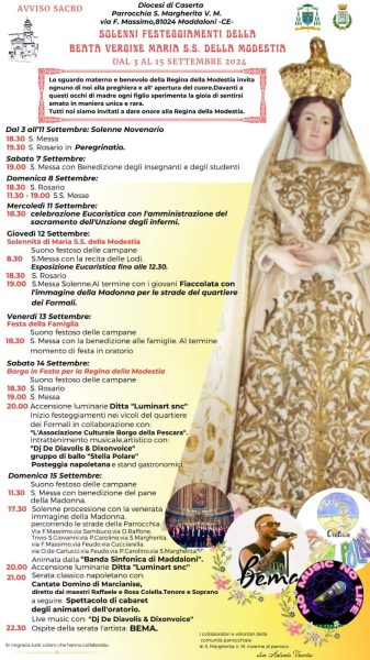 Maddaloni- Tutto il quartiere è in festa già dai primi di settembre. La Madonna della Modestia, che si trova nella chiesa di Santa Margherita, ogni anno viene festeggiata con devozione e tanta gioia. Le bandiere che annunciano la