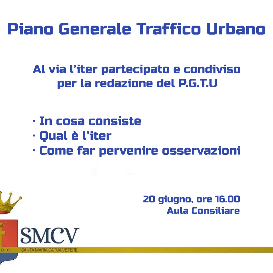 Giovedì 20 giugno (ore 16.00), presso l’aula consiliare del Comune di Santa Maria Capua Vetere, si svolgerà il primo confronto pubblico con la città nell’ambito della redazione del Piano Generale del Traffico Urbano che l’amministrazione comunale guidata dal sindaco Antonio Mirra ha voluto inserire immediatamente in un percorso condiviso con i cittadini fin dalle sue prime fasi.