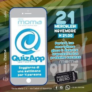 . L’ingresso è sempre libero. Un’attenta ed equilibrata programmazione quella predisposta dall’art director Gigio Rosa: si comincia il martedì, con la serata “El Moma Latino” in collaborazione con il gruppo AlmaLibre, già protagonista delle notti caraibiche del casertano e dintorni. Il mercoledì si gioca con il proprio smartphone a QuizApp, innovativa formula di quiz interattivo, con la possibilità di conquistare soggiorni, vacanze, gadget ed altri regali. Il giovedì sera spazio alla musica dal vivo con i “Moma LoveLive”