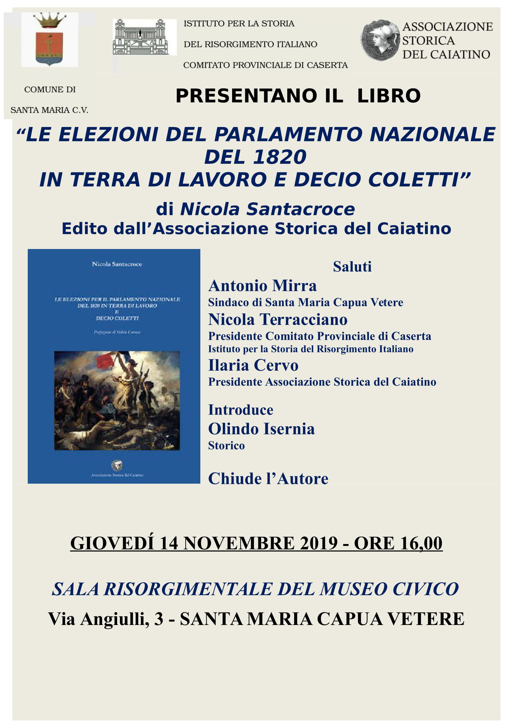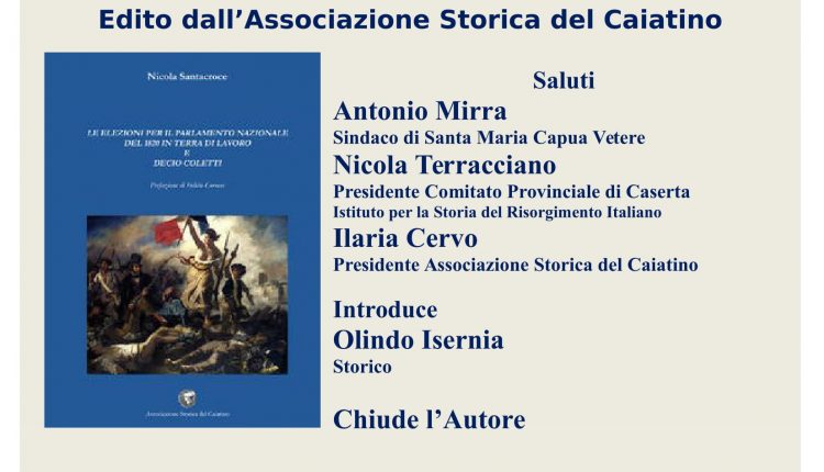 Le elezioni del Parlamento nazionale del 1820 in Terra di Lavoro e Decio Coletti. Un lunghissimo titolo, ma un entusiasmante lavoro di ricerca storica. L’autore è Nicola Santacroce, che all’attivo ha tantissime pubblicazioni tutte finalizzate alla riscoperta degli angoli più nascosti della storia locale di Terra di Lavoro ed in particolare della zona del caiatino.