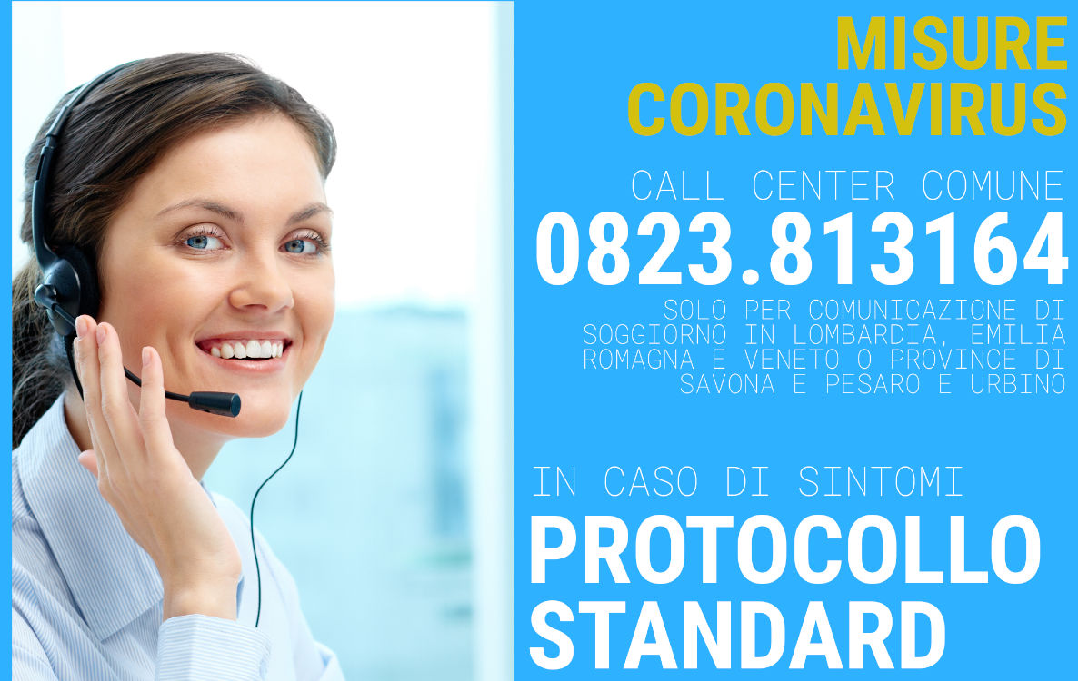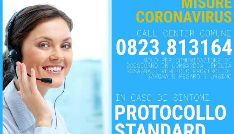 Numero del call center comunale: 0823.813164 (dal lunedì al venerdì dalle ore 9.00 alle ore 13.30). I cittadini che, invece, presentano i sintomi da Coronavirus devono seguire il protocollo standard e, quindi, contattare il proprio medico di base o in alternativa il 112, il 118 o il numero verde della Regione Campania 800.90.96.99; NON devono quindi contattare il call center del Comune.